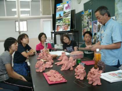 シーサー工房「ゆいまーる」代表の米田文泰さんを講師にお招きし、教職員の図画工作実技研修会を行いました。もちろん、シーサーの作り方を学ぶ研修会です。