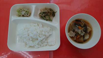 今日の献立は、「鶏肉のごまだれ焼き」「ソーキ汁」「チンゲンサイともやしの甘酢あえ」「ごはん」「牛乳」です。ソーキ汁は、沖縄の郷土料理です。ソーキとは、豚のあばら肉のことで、給食ではだいこん、白ねぎなどの野菜やこんぶなどと一緒に煮込んでいます。ばら肉はいったんゆでて、余分な脂を落とす工夫をしています。