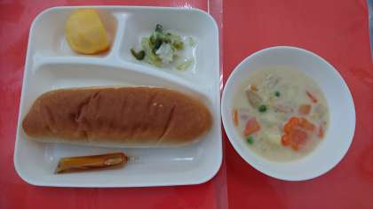 今日の献立は、「コーンクリームシチュー」「キャベツと三度豆のサラダ」「かき(平核無柿)」今月のコーンクリームシチューは、小麦アレルギーのある子どもたちも食べられるように、上新粉(米の粉)でとろみをつけています。旬のくだものの柿は、年に1回のみの登場です。