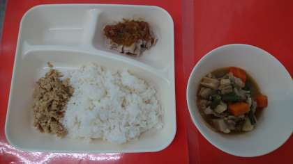 今日の献立は、「豚肉のねぎだれかけ」「鶏肉とれんこんの煮もの」「ツナ大豆そぼろ」「ごはん」「牛乳」です。ひきわり大豆は、大豆をゆでて、こまかくくだいたものです。大豆には、たんぱく質やカルシウム、食物繊維、鉄が含まれています。今日はツナ大豆そぼろにしました。