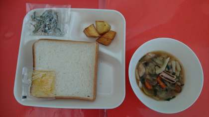 今日の献立は、「中華煮」「大学いも」「ミニフィッシュ」「食パン」「マーマレード」「牛乳」です。大学いもは、旬のさつまいもを油であげて、みつをからめたものです。とても好評でした。
