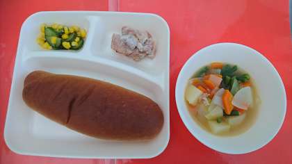 今日の献立は、「鶏肉のガーリック風味焼き」「スープ煮」「きゅうりとコーンのサラダ」「黒糖パン」「牛乳」です。「鶏肉のガーリック風味焼き」の味付けには、ノンエッグドレッシングを使っています。マヨネーズのような味がしますが、卵を使っていないマヨネーズ風の調味料です。卵アレルギーの人も食べることができます。