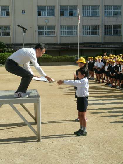 大阪市小学校児童絵画版画展に作品が選ばれた2名と、南市岡FMKキックベースボール大会で3位になった弁天小キックベースボールチームに校長先生から賞状が手渡されました。