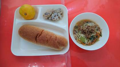 今日の献立は、「タンタンめん」「れんこんのオイスターソース焼き」「みかん」「ライ麦パン」「牛乳」です。タンタンめんは、中国の四川料理を代表するめん料理です。白ねぎ、しょうがなどの香味野菜とみそやテンメンジャンなどで味つけした肉みそを、配食時に汁めんの上にのせて食べます。テンメンジャンは、深い赤色と甘みが特徴のみそです。
