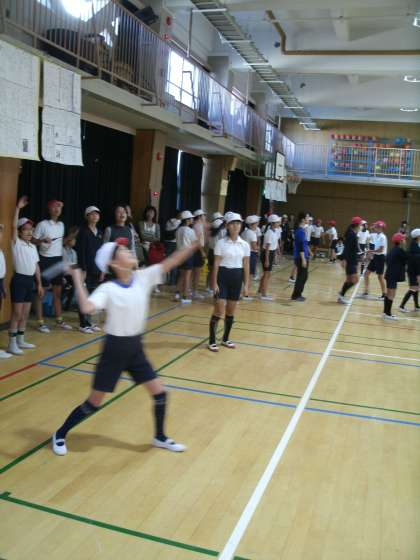 2時間目は、岩城さん中村さんの指導の下、講堂でシャトルを打ちました。
