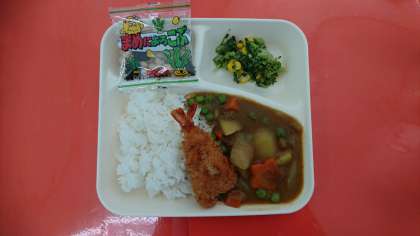 今日の献立は、「えびフライカレーライス」「ブロッコリーとコーンのサラダ」「豆こんぶ」「牛乳」です。カレーライスは毎回とても好評な献立です。風邪の予防によいとされるビタミンCが豊富なブロッコリーとの組み合わせです。