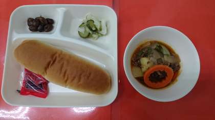 今日の献立は、「牛肉と野菜の洋風煮」「キャベツときゅうりのサラダ」「うずら豆のグラッセ」「コッペパン」「牛乳」です。グラッセは、フランス料理の1つで、肉料理や魚料理にそえることが多いです。野菜や豆などを、バター、砂糖、塩を加えた水で、水分がなくなるまで煮て、表面につやを出して仕上げます。