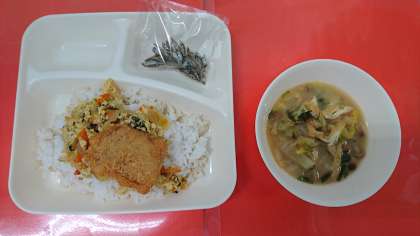 今日の献立は、「カツ丼」「なめこのみそ汁」「ミニフィッシュ」「牛乳」です。カツ丼は、1人1個の一口トンカツを添えるボリュームのある丼です。みそ汁に入っているなめこには、ぬめりがあり、そのぬめりには、食べものの消化や栄養の吸収をたすけたりする働きがあります。