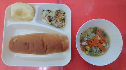 今日の献立は、「鶏肉と野菜のスープ煮」「ほうれん草のグラタン」「りんご」「レーズンパン」「牛乳」です。冬野菜のひとつ、ほうれん草を使用したグラタンです。下ゆでした鮮やかな緑色を残したほうれん草と、ホワイトソースの白色があざやかな目でも楽しめる献立です。冬のほうれん草は、夏のものにくらべ、2〜3倍のビタミンを含み、甘みが増して味もよいと言われます。今日のスープ煮には、フォークのかたちのラッキーにんじんがはいっていました。