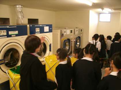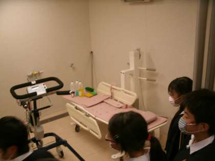 寝ながら入ることができるお風呂場の設備や大きな洗濯機を見せていただきました。