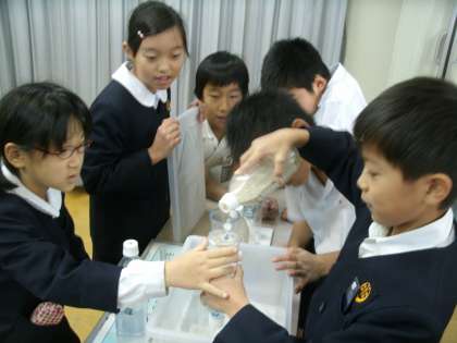 多目的室で説明を受け、グループごとに実験です