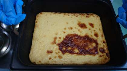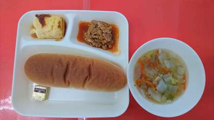 今日の献立は、「豚肉のケチャップソテー」「はくさいのスープ」「焼きプリン」「コッペパン・バター」「牛乳」です。給食のプリンは給食室で作る手作りのプリンです。卵と牛乳、生クリーム、砂糖のみで生地を作り、底に敷くカラメルソースも砂糖を焦がして作ります。1クラス分ずつミニバットにいれて、焼き物機で焼きます。(写真2枚目)甘さとカラメルソースの程よい香ばしさが人気の献立です。