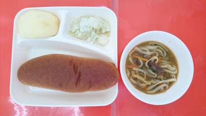 今日の献立は、「カレーうどん」「キャベツの甘酢あえ」「りんご」「黒糖パン」「牛乳」です。カレーうどんは、牛肉、野菜をサラダ油で炒めて、だしを加えて煮、カレールウの素などで味付けした、寒い時期に体の温まる一品です。