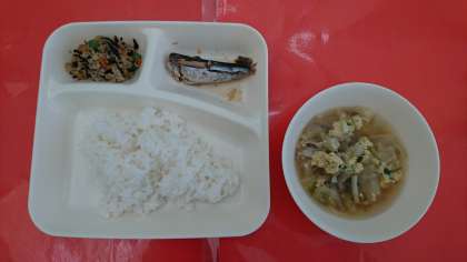 今日の献立は、「いわしのしょうが煮」「かきたま汁」「高野どうふのいり煮」「ごはん」「牛乳」です。かきたま汁は、鶏肉、旬のはくさいやだいこん、にんじん、生しいたけ、みつばを使用して、最後に卵を流し入れます。『卵』の除去を行うことができる個別対応献立です。
