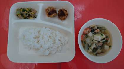 今日の献立は、「あげシューマイ」「えびととうふのスープ」「ツナとチンゲンサイのいためもの」「ごはん」「牛乳」です。あげシューマイは、とても好評な献立です。