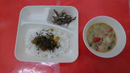 今日は、お正月の行事献立です。「きんぴらちらし」「ぞう煮」「ごまめ」「牛乳」です。「ぞう煮」は、かつおぶしでだしをとり、白みそを多く使った関西風の仕上がりで、白玉もちや金時にんじんを具材にすることにより、紅白でおめでたいお正月らしさを出しています。金時にんじんは、この季節に主に正月用として出回り、大阪市なにわの伝統野菜のひとつです。おせち料理には、新年を祝う気持ちやいろいろな願いをこめたものがたくさん入っています。