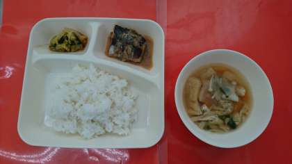 今日の献立は、「さばのみそ煮」「五目汁」「きくなとはくさいのおひたし」「ごはん」「牛乳」です。