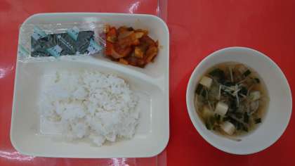 今日の献立は、「酢豚」「とうふのスープ」「焼きのり」「ごはん」「牛乳」です。酢豚は、あまずっぱいあんでからめた中国料理の1つです。