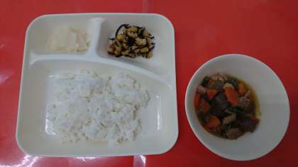 今日の献立は、「筑前煮」「ひじき豆」「だいこんのゆず風味」「ごはん」「牛乳」です。筑前煮は、福岡県の郷土料理です。ひじき豆は、鉄や食物繊維を多く含む献立で、子どもたちにとても人気があります。