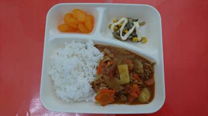 今日の献立は、「ポークカレーライス」「ごぼうサラダ」「みかん(缶詰)」「牛乳」です。ポークカレーライスは、子どもたちにとても好評でした。今日のラッキーにんじんは、花とうさぎです。