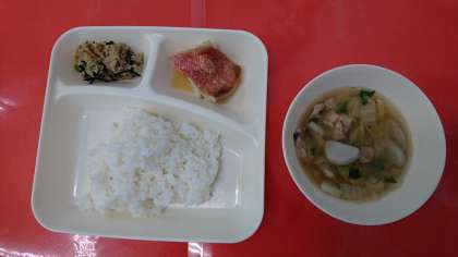 今日の献立は、「赤魚のレモンじょうゆかけ」「うすくず汁」「高野どうふのいり煮」「ごはん」「牛乳」です。赤魚のレモンじょうゆかけは、白身のあっさりとした赤魚を、レモンのさわやかな香りと酸味を添えたしょうゆだれで味わえるようにと考えた献立です。国産のレモンを給食室でしぼって使用しています。