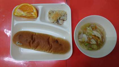 今日の献立は、「押し麦のグラタン」「スープ」「デコポン」「レーズンパン」「牛乳」です。鶏肉と押し麦を使用したホワイトソースのグラタンです。押し麦は不足しがちな食物繊維を多く含み、プチプチとした食感も楽しめます。バターを使ってコクのある仕上がりで子どもたちに毎回好評な献立です。デコポン(1人1/4切)との組み合わせです。(写真2枚目)