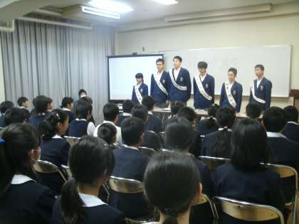 生徒会執行部の皆さんです。市岡中学校での生活について説明後、6年生からの質問にも丁寧に答えてくださいました。