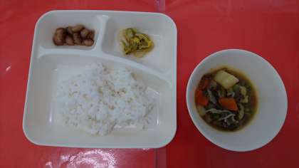 今日の献立は、「肉じゃが」「はくさいのゆず風味」「とら豆の煮もの」「ごはん」「牛乳」です。とら豆は金時豆と同じ、いんげん豆の種類になります。豆の模様が虎の模様に似ていることからこの名前がついたといわれています。(煮ると模様はわかりにくくなります)