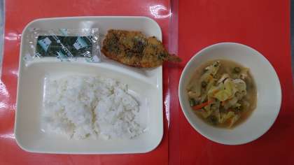 今日で6年生は小学校での給食が終了しました。献立は、「いわしのフライ」「みそ汁」「焼きのり」「ごはん」「牛乳」です。