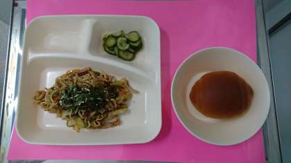 今日の献立は、「焼きそば」「きゅうりのしょうがづけ」「黒糖クレセントロールパン」「牛乳」です。ソース味の人気定番メニューです。食べるときにきざみのりをかける、のりの風味のきいた焼きそばです。1年生は、小学校ではじめての給食ですが、とてもよく食べていました。給食を好きになってほしいと思います。