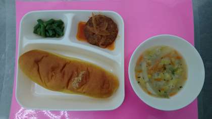 今日の献立は、「煮込みハンバーグ」「コーンスープ」「三度豆のサラダ」「パンプキンパン」「牛乳」です。いためたたまねぎと、ケチャップとウスターソースで味付けしたソースでじっくりと煮込んだハンバーグはとても好評です。