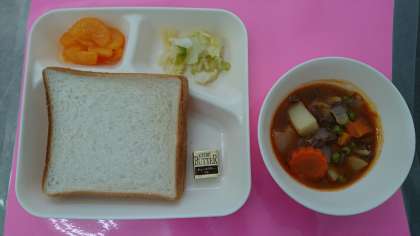 今日の献立は、「ビーフシチュー」「キャベツのピクルス」「みかん(缶詰)」「食パン・バター」「牛乳」です。ビーフシチューは、牛肉とじゃがいも、野菜をやわらかく煮て、手作りのブラウンルウでとろみをつけています。今日は、チューリップと花のラッキーにんじんがはいっていました。