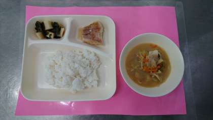今日の献立は、「赤魚のしょうゆだれかけ」「みそ汁」「わかたけ煮」「ごはん」「牛乳」です。わかたけ煮のわかめは、採れたわかめをその日のうちに急速凍結し、冷凍した生わかめを使用しています。なめらかな表面と適度な歯ごたえを感じることができます。