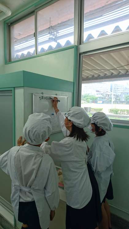 5年生の給食委員会の活動がスタートしました。給食室の献立ボードを記入したり、当番への受け渡しや給食カレンダーの放送をします。はじめての委員会活動、緊張しながらも笑顔でがんばっています。