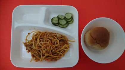 今日の献立は、「スパゲッティミートソース」「きゅうりのピクルス」「黒糖クレセントロールパン」「牛乳」です。手作りのブラウンルウで仕上げるスパゲッティは、毎回子どもたちに好評です。
