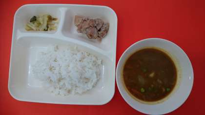 今日の献立は、「鶏肉のガーリック焼き」「カレースープ」「サワーソテー」「ごはん」「牛乳」です。ガーリックは、にんにくを乾燥して、粉にしたもので、香辛料の1つです。植物の葉の部分を食べています。