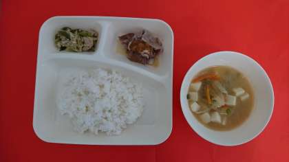 今日の献立は、「豚肉のおろしじょうゆかけ」「みそ汁」「野菜いため」「ごはん」「牛乳」です。豚肉のおろしじょうゆかけは、焼き物機で焼いた豚肉に、だいこんおろし、みりん、こい口しょうゆ、ゆずを合わせて作った香りのよいタレをかけて仕上げています。
