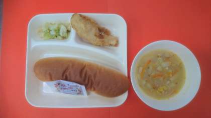 今日の献立は、「サーモンフライ」「コーンスープ」「キャベツのソテー」「大型コッペパン・いちごジャム」「牛乳」です。サーモンフライは、毎回子どもたちにとても好評です。