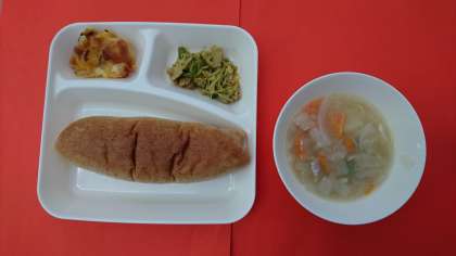 今日の献立は、「鶏肉と野菜のスープ煮」「カレーソテー」「ミックスフルーツのクラフティ」「ライ麦パン」「牛乳」です。クラフティは、フランスリムーザン地方発祥の焼き菓子で、タルト生地に季節の果物を並べ、卵、牛乳、砂糖などを加えて焼き上げたプリンのような菓子です。給食のクラフティは、コーンフレークを敷いた上に、生地を流し入れて焼き物機で焼いています。