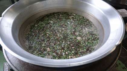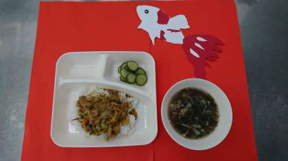 今日の献立は、「和風カレー丼」「もずくとオクラのとろり汁」「きゅうりの酢のもの」「牛乳」です。もずくは、暖かくてあさい海で育つ、海藻で4〜6月が旬です。今日のもずくは沖縄県でとれたものです。2枚目の写真は、とろり汁を釜で炊いているところです。