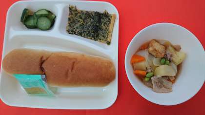 今日の献立は、「もずく入りヒラヤーチー」「豚肉といかの煮もの」「あっさりきゅうり」「コッペパン・りんごジャム」「牛乳」です。