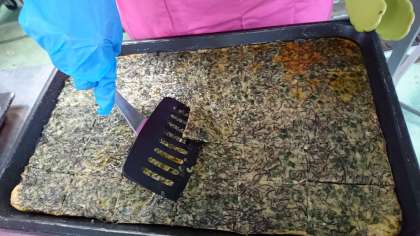 ヒラヤーチーというのは、沖縄の家庭料理で、「平焼き」の意味があります。チヂミやお好み焼きのようなもので、給食では、沖縄らしくもずくを入れています。焼き物機で焼き、1人1切れに切り分けます。