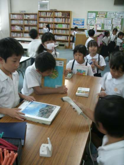 本の 貸し出し 返却はバーコードで管理しています