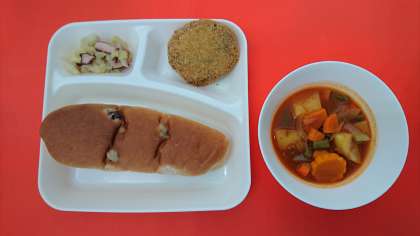 今日の献立は、「チキンレバーカツ」「ケチャップ煮」「たことキャベツのソテー」「レーズンパン」「牛乳」です。子どもたちに人気のある「チキンレバーカツ」は、ほんのりカレー味がついて食べやすく、不足しがちな鉄分をとることができます。