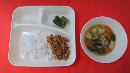 今日の献立は、「豚肉とじゃがいもの煮もの」「オクラのかつお梅風味」「紅ざけそぼろ」「ごはん」「牛乳」です。オクラを食べるとネバネバしています。食物繊維が多く含まれていて、おなかのそうじをしてくれます。