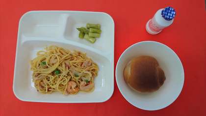 今日で1学期の給食が終了しました。献立は、「シーフードトマトスパゲッティ」「グリーンアスパラガスのサラダ」「はっ酵乳」「黒糖クレセントロールパン」「牛乳」です。オリーブ油でにんにくをいためることで、にんにくの香りを際立たせ、相性のよいシーフードとトマトを組み合わせたスパゲッティです。トマトは旬の生のトマトを用いています。