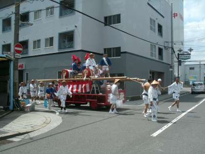 暑い中 弁天のまちを 太鼓が ひかれています