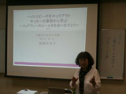 講師に相愛大学の富岡美知子先生をお招きし「スポーツと人権」「ヘイトスピーチについて考える」をテーマに、研修会を行いました。