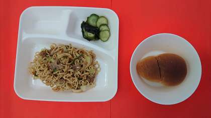献立は、「焼きそば」「きゅうりとわかめの中華あえ」「黒糖クレセントロールパン」「牛乳」です。ソース味で、子どもたちに人気のあるいため麺です。