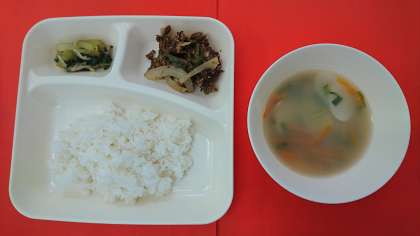 今日の献立は、「プルコギ」「トック」「チンゲンサイともやしの甘酢あえ」「ごはん」「牛乳」です。韓国・朝鮮の料理である「プルコギ」、「トック」を組み合わせています。「プルコギ」は、焼き肉のことで、少し甘辛い味付けに仕上げています。